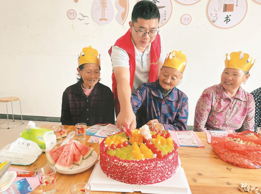 在老人集体生日会上,林友权(左二)给老人点燃生日蜡烛。(受访者供图)
