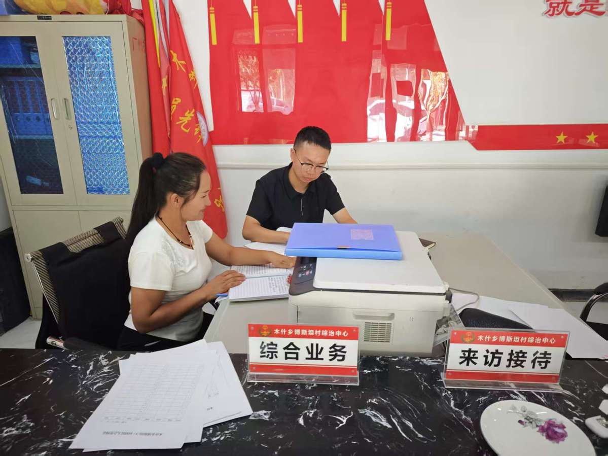 李博(右)在核对治理台账。(博斯坦村村委会供图)