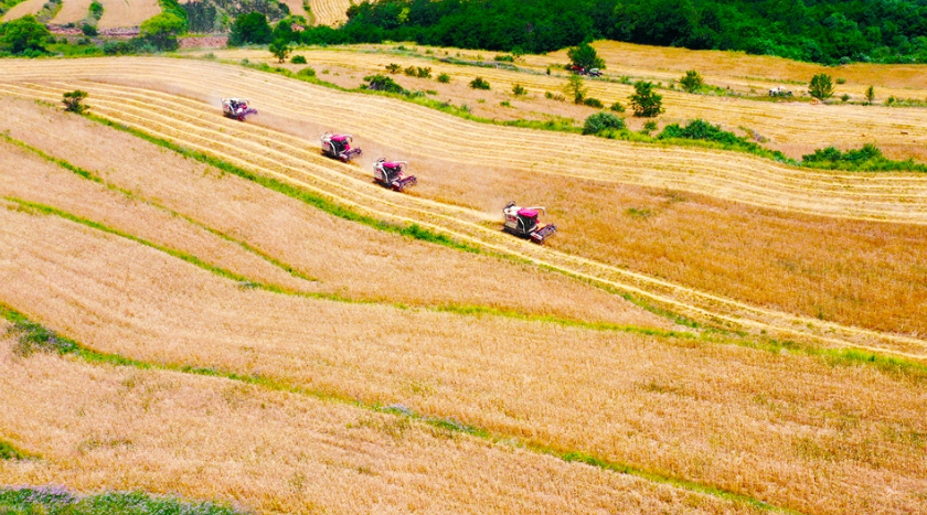 收割机正在麦田中穿梭作业。(清水县委组织部供图)