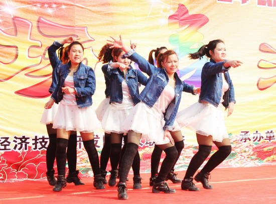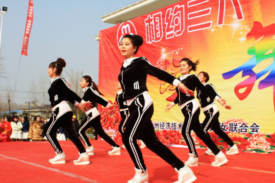 3月7日,江苏省徐州经济技术开发区妇联在该区大庙街道办事处市民广场,举办大型演出:迎三八  舞动的开发区。该开发区的女大学生村官们发挥她们能歌善舞的本领,她们编演的舞蹈《舞动的青春》《青春似火》以活力四射、热情奔放的舞姿,在13支队伍中脱颖而出,获得一、二等奖,受到广大干群的好评。图为:女大学生村官在跳舞。