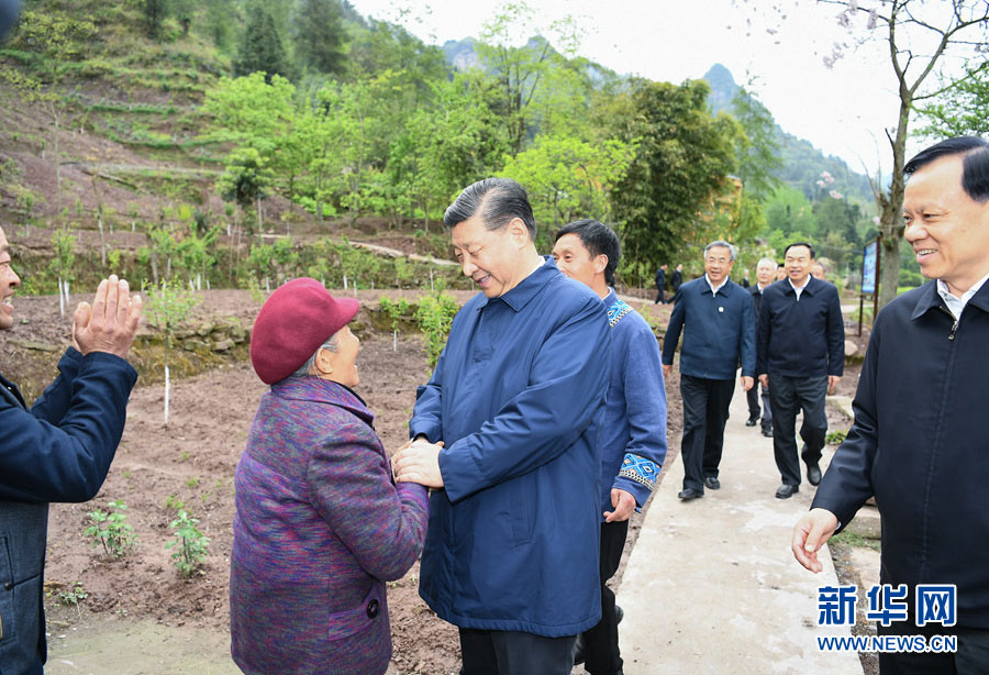2019年4月15日下午,习近平在石柱土家族自治县中益乡华溪村看望老党员、已脱贫户马培清一家。 新华社记者 谢环驰 摄