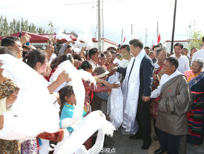 总书记的到来让这个藏族村庄沸腾了。22日下午,习近平来到格尔木市唐古拉山镇长江源村考察生态移民、民族团结和基层党建工作。村民们身着盛装,献上洁白的哈达、切玛、青稞酒,表达对总书记最隆重最热烈的欢迎。