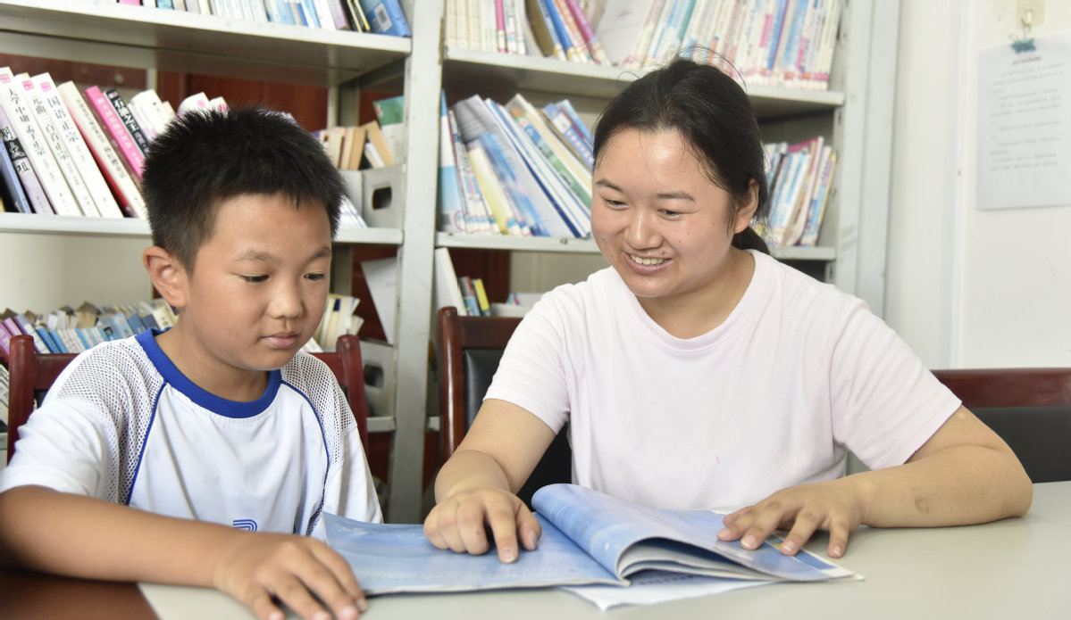 谭江琴(右)陪村里孩子读课外书。(镇远县委组织部供图)