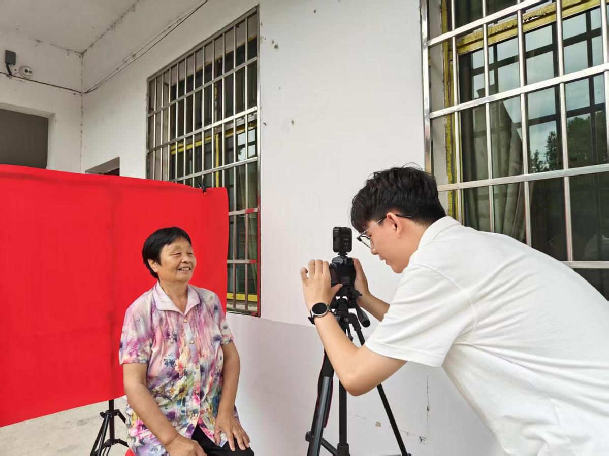 曹鹏(右一)在村为老人拍摄照片 (畔山村村委会 供图)