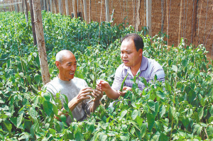 图为杜海军(右)在蔬菜大棚内和村民一起查看辣椒生长情况。