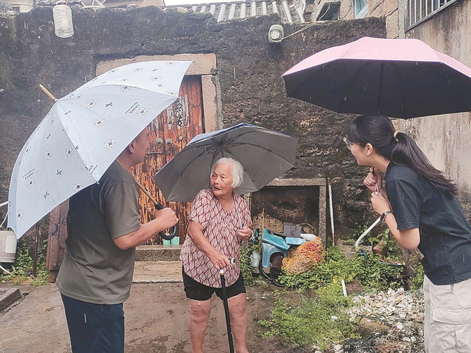 林佳欣(右一)在台风天入户劝老人转移。(汫平社区党委供图)