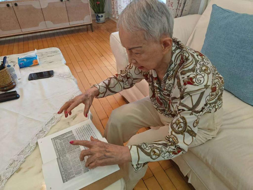 傅莱的遗孀江国珍女士讲述傅莱奔赴晋察冀边区支援抗战的经历(2025年8月23日摄)。新华社记者黄扬摄