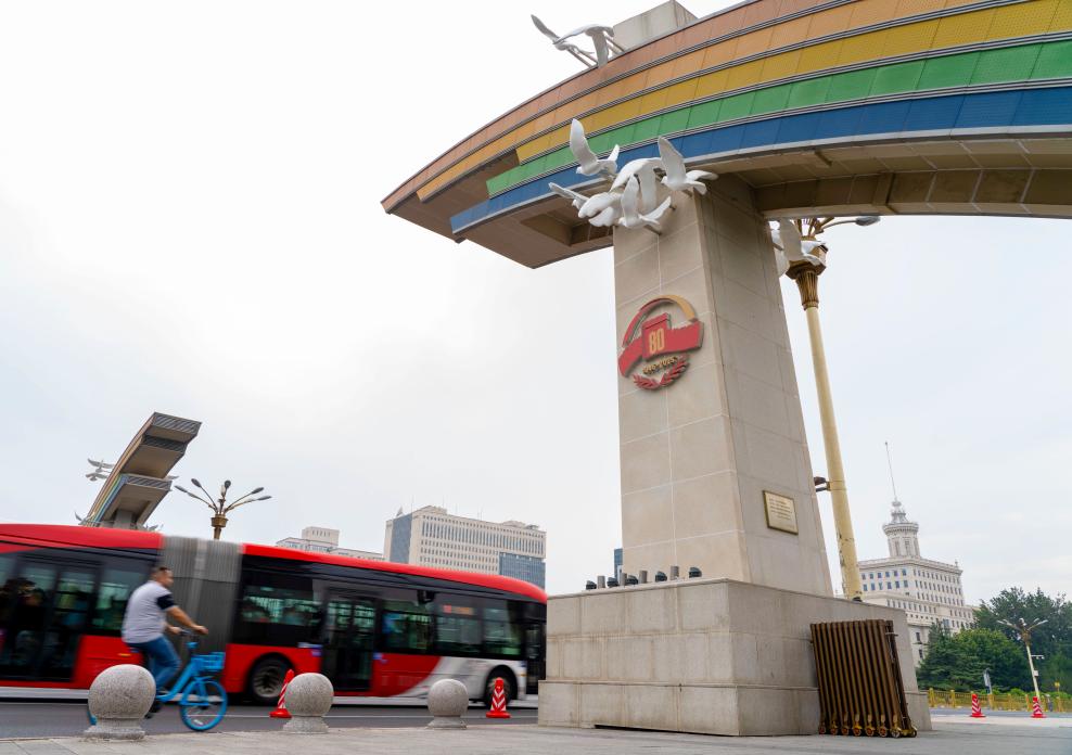 8月29日,车辆经过复兴门桥上的彩虹门。北京市综合运用多种形式进行景观布置工作,纪念中国人民抗日战争暨世界反法西斯战争胜利80周年。新华社记者谢晗摄