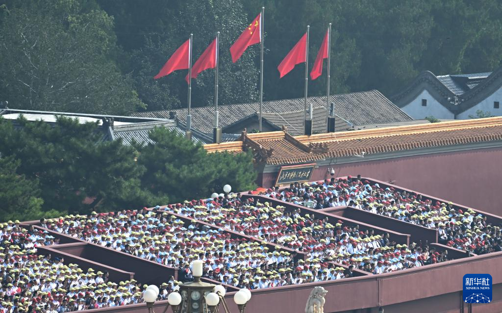 9月3日,纪念中国人民抗日战争暨世界反法西斯战争胜利80周年大会在北京隆重举行。这是观众在挥舞国旗。