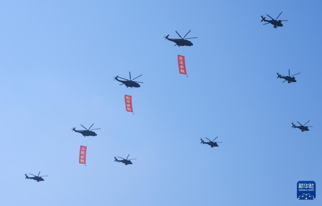 9月3日,纪念中国人民抗日战争暨世界反法西斯战争胜利80周年大会在北京隆重举行。这是空中护旗梯队。